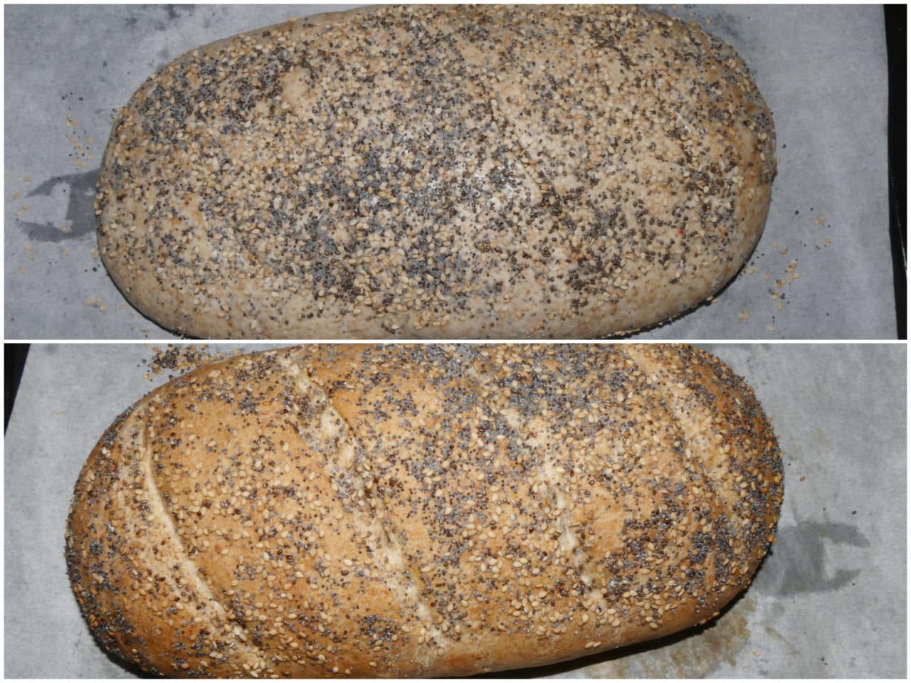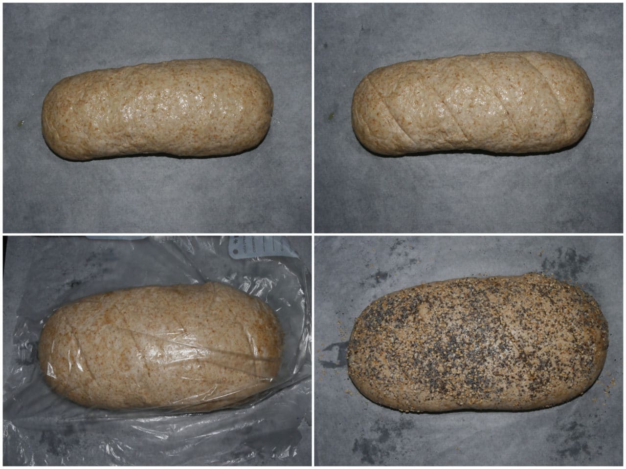 Trasferite sulla teglia rivestita di carta forno, effettuate qualche incisione sulla pagnotta per aiutare la cottura, quindi coprite con pellicola e lasciate lievitare in un luogo asciutto per almeno 2 ore o finché non sarà almeno raddoppiato.