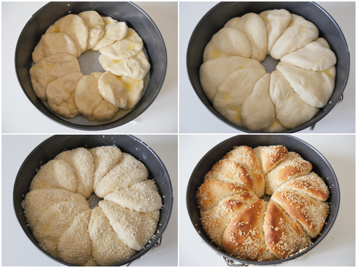 Il pane serbo è un lievitato molto particolare (anche un po' scenografico, se vogliamo dirla tutta) ma anche semplice da fare. Conosciuto come Pogača, e’ un pane molto soffice che assomiglia ad un panbrioche e che viene ricoperto, di soli8to, da semi di sesamo. Inoltre, cosa importante, non solo è facile da preparare e bello da vedere, ma anche molto buono. Si tratta di un normale impasto di pane al latte, presentato però in modo da sembrare quasi un fiore. In più, per via del metodo con cui si dispone nella teglia, inframmezzando le varie parti con un po' di burro sciolto, potete tirar via le fette come se fossero appunto i petali di un fiore (un po' come il pull apart bread). Bello, vero?