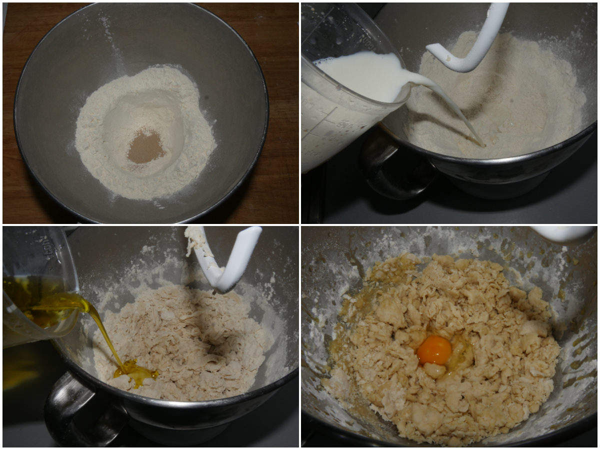 Mettete le farine, lo zucchero e il lievito in una ciotola, iniziate a impastare versando il latte poco per volta, poi incorporate sale, olio e infine anche l'uovo.