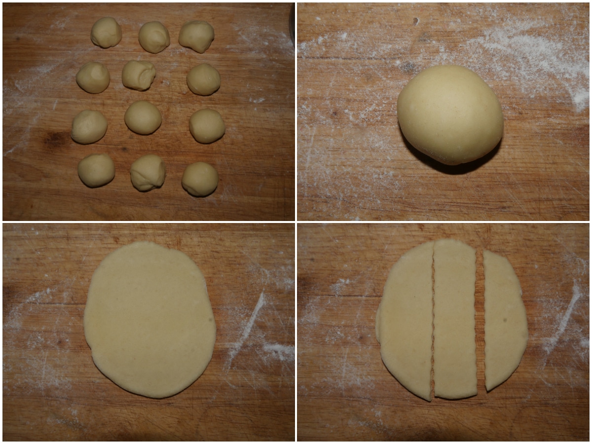 Dividete l'impasto in palline da circa 40 gr l'una e, una per volta, stendetele e ricavate da ognuna 3 strisce di impasto larghe all'incirca quanto mezzo wurstel.