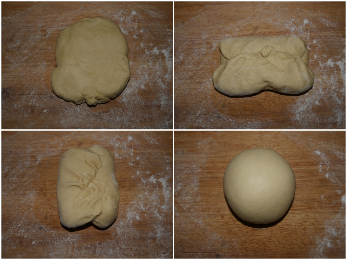 Riprendete l'impasto, sgonfiatelo con le mani leggermente infarinate, appiattitelo sul piano di lavoro ed effettuate delle pieghe: portate prima i due lembi superiore e inferiore verso il centro, poi fate lo stesso con i lembi destro e sinistro.