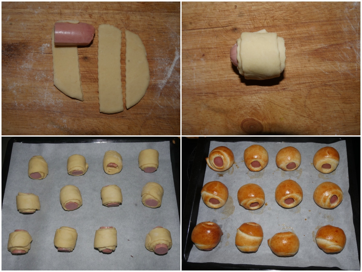 Tagliate i wurstel a metà (in alternativa potete usare anche i mini wurstel da cocktail) e avvolgete ogni pezzetto con una striscia di impasto.