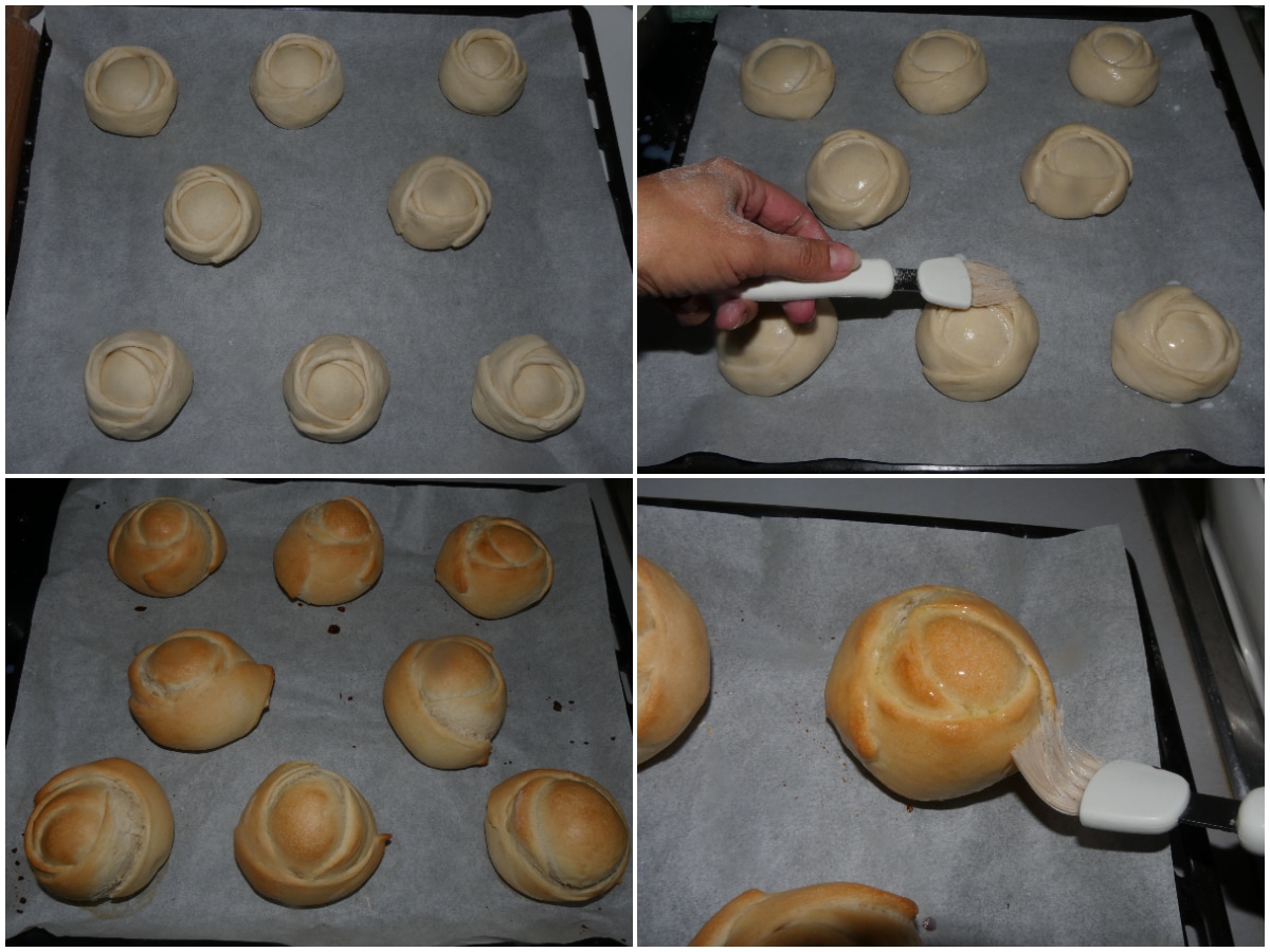 Man mano che sono pronti, disponete i panini sulla teglia rivestita di carta forno, spennellateli con il burro sciolto, poi cuocete per circa 25 minuti a 180°C, in forno ventilato già caldo e, una volta cotti, spennellateli ancora col burro.