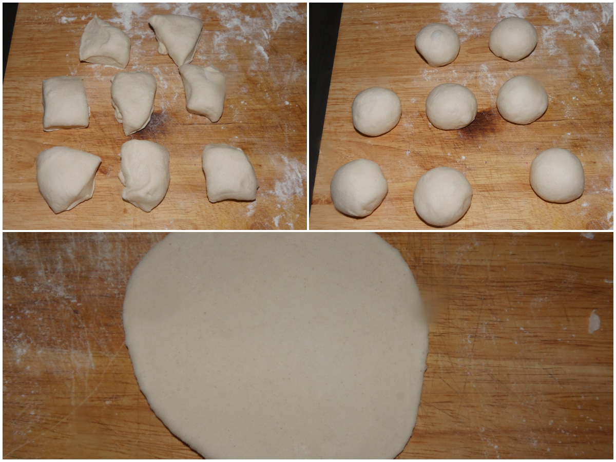 Iniziate ad assemblare i panini: dividete l'impasto in 16 panettini uguali: sagomate la metà (8) di questi in palline e stendete l'altra metà con il matterello a creare delle sfoglie sottili.
