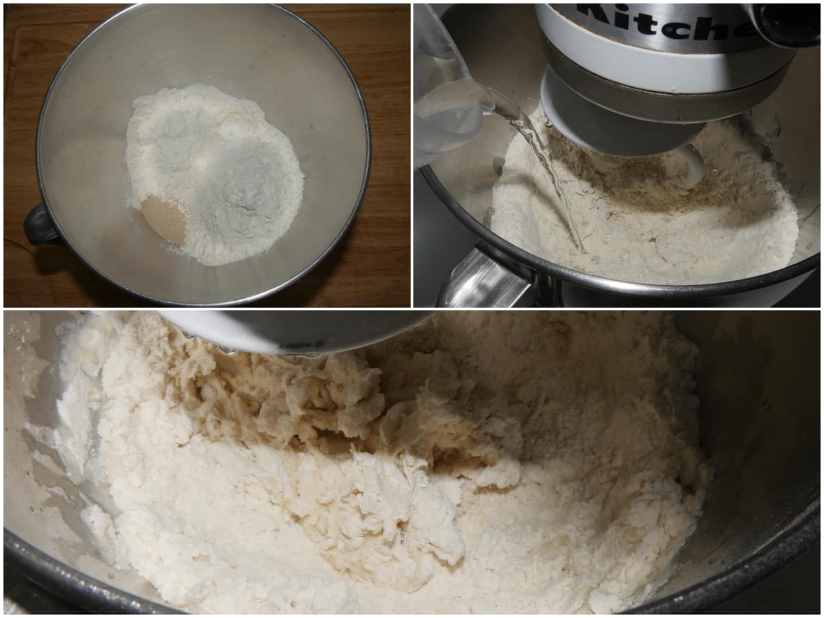 Preparate l'impasto: mettete in una ciotola farine, lievito e zucchero e mescolate, poi incorporate l'acqua.