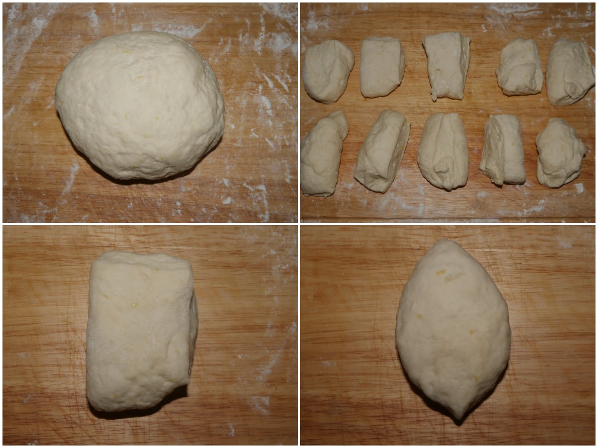 Dividete l'impasto in 10 porzioni uguali (dovrebbero essere da circa 80 g l'una) e sagomateli a forma di limone, dandogli prima una forma ovale e poi comprimendo le 2 estremità opposte.
