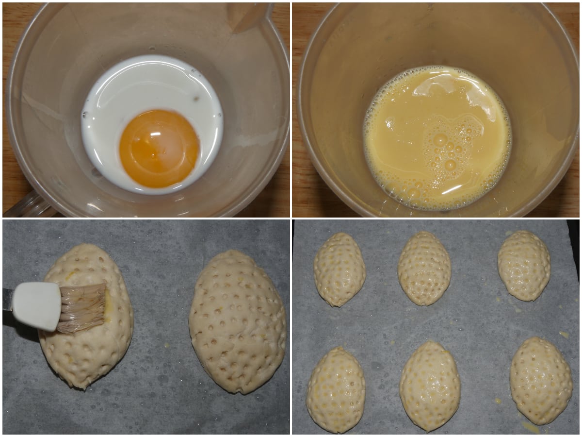 Sbattete il tuorlo con il latte e spennellate i paninetti, quindi cuoceteli per circa 25-30 minuti in forno statico preriscaldato a 210°C, dopo aver messo sul fondo del forno una teglia piena per metà di acqua, in modo da rendere la cottura più delicata (perché sarà in parte a vapore) e lasciarli ancora più morbidi.