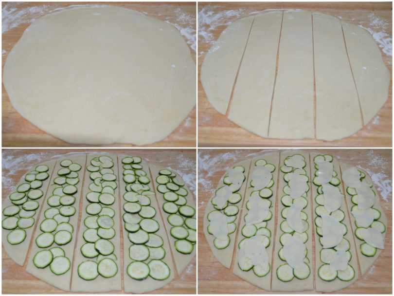 Ricavate delle strisce larghe circa 8-10 cm, quindi distribuite su di esse prima le fettine di zucchine e poi la provola.