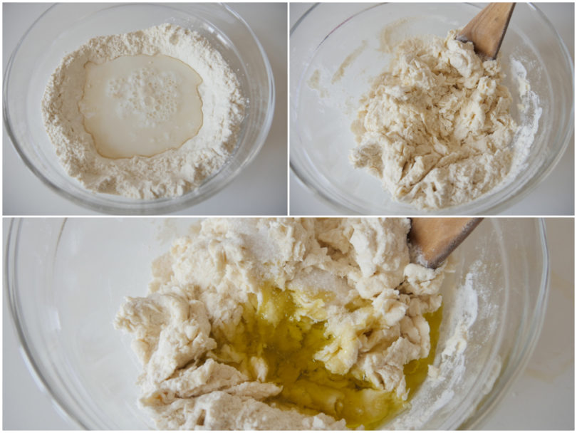 Iniziate ad aggiungere il latte intiepidito, quindi unite anche sale e olio e impastate velocemente fino ad ottenere un panetto morbido e omogeneo.