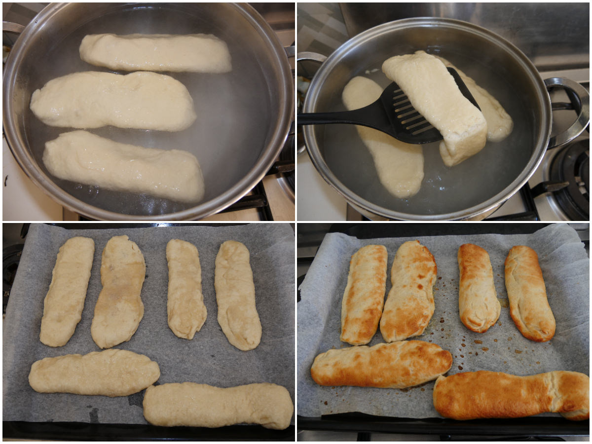 Fate scaldare dell'acqua in una pentola capiente e, quando bolle, calate i panini e cuoceteli giusto 2 minuti, dopo di che disponete i panini sulla teglia rivestita di carta forno e cuocete per circa 15-20 minuti a 200°C, in forno ventilato già caldo.
