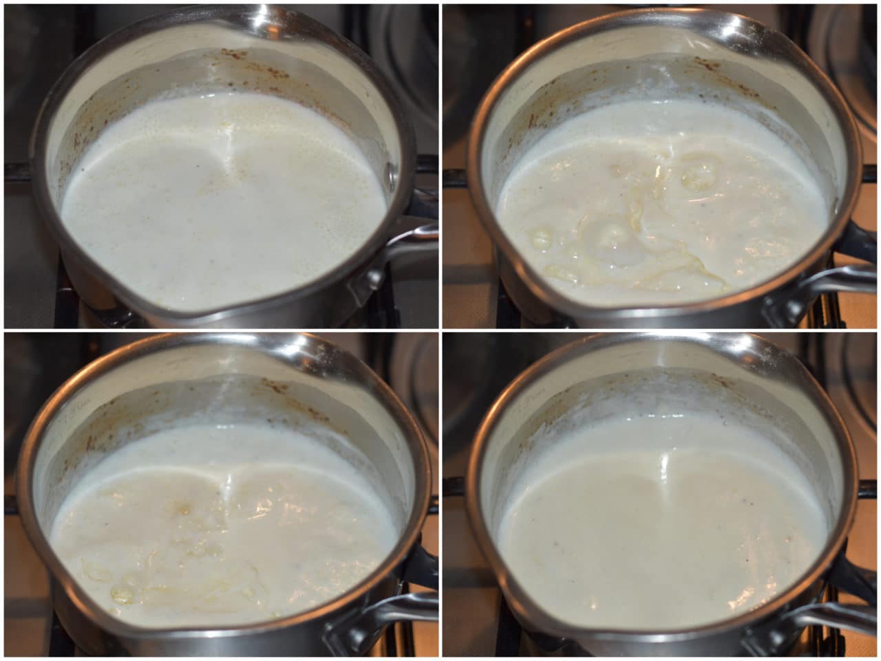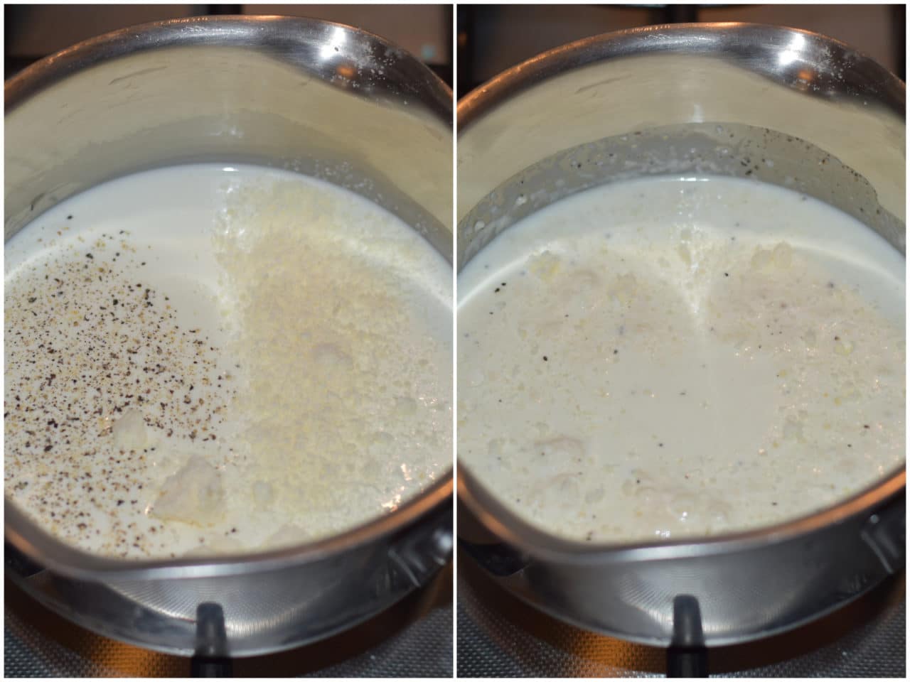Mettete in un pentolino panna, latte, grana, sale e pepe e mescolate bene, quindi portate a ebollizione, mescolando costantemente, lasciate cuocere ancora per 1 minuto e spegnate.