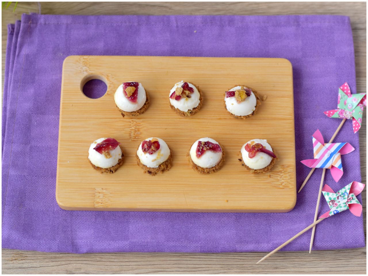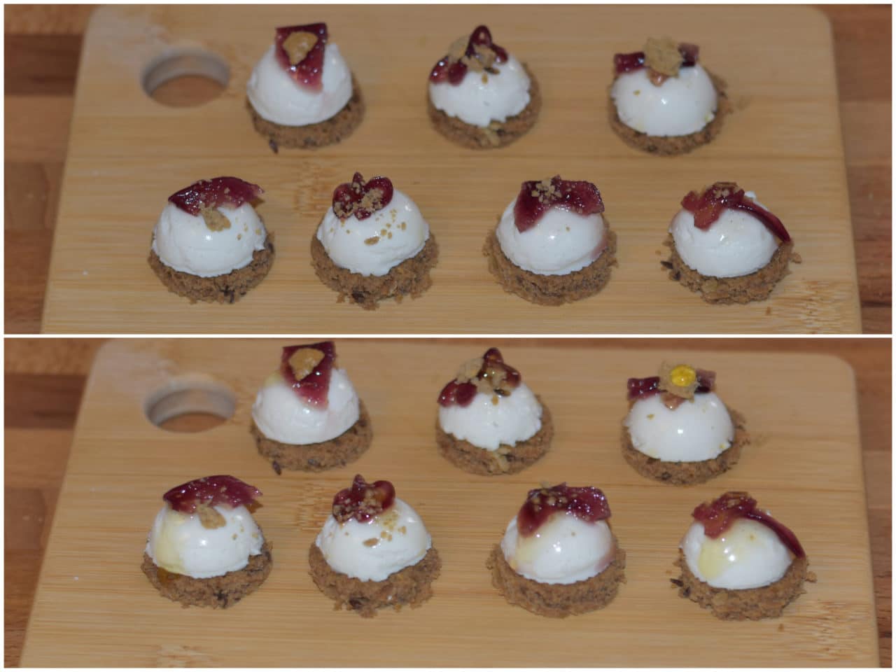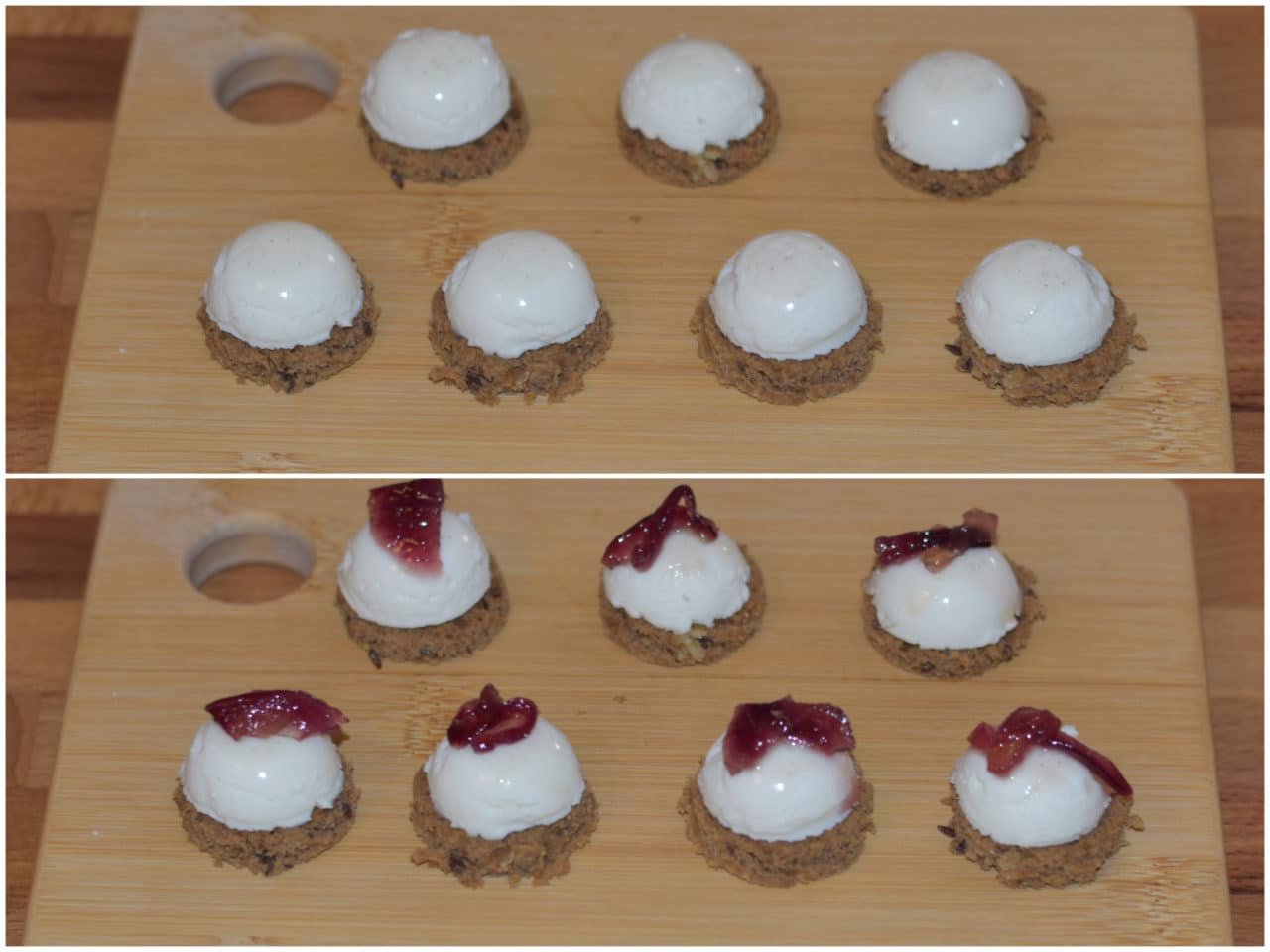 Iniziate ad assemblare: disponete su di un tagliare o un piatto da portata i dischi di pane e poggiate una panna cotta su ognuno di essi, quindi coronate con un pochino di cipolla.