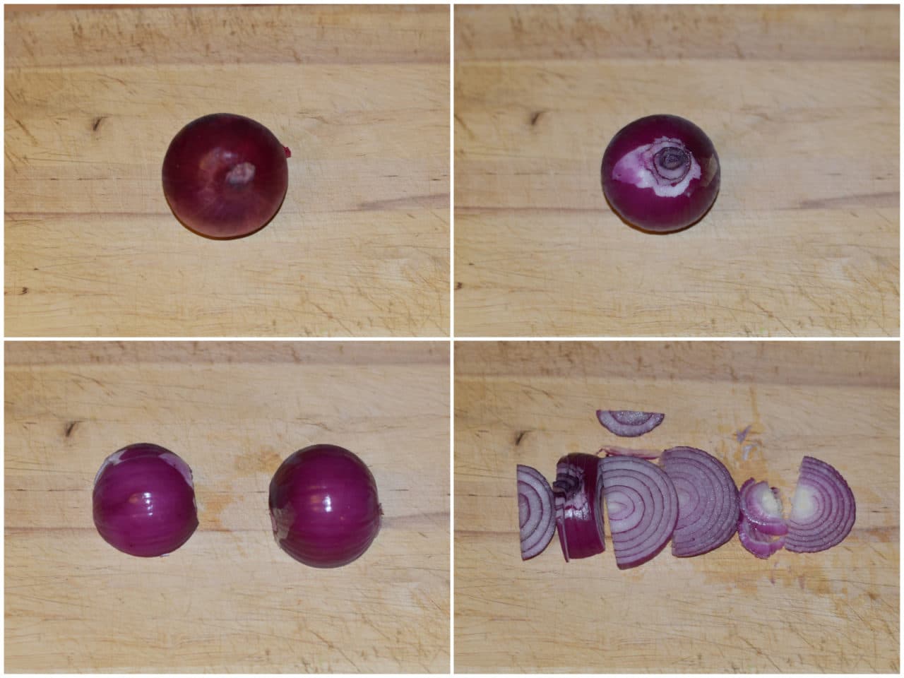Dedicatevi ora alla cipolla: mondatela e tagliatela prima a metà a poi a fettine sottili.