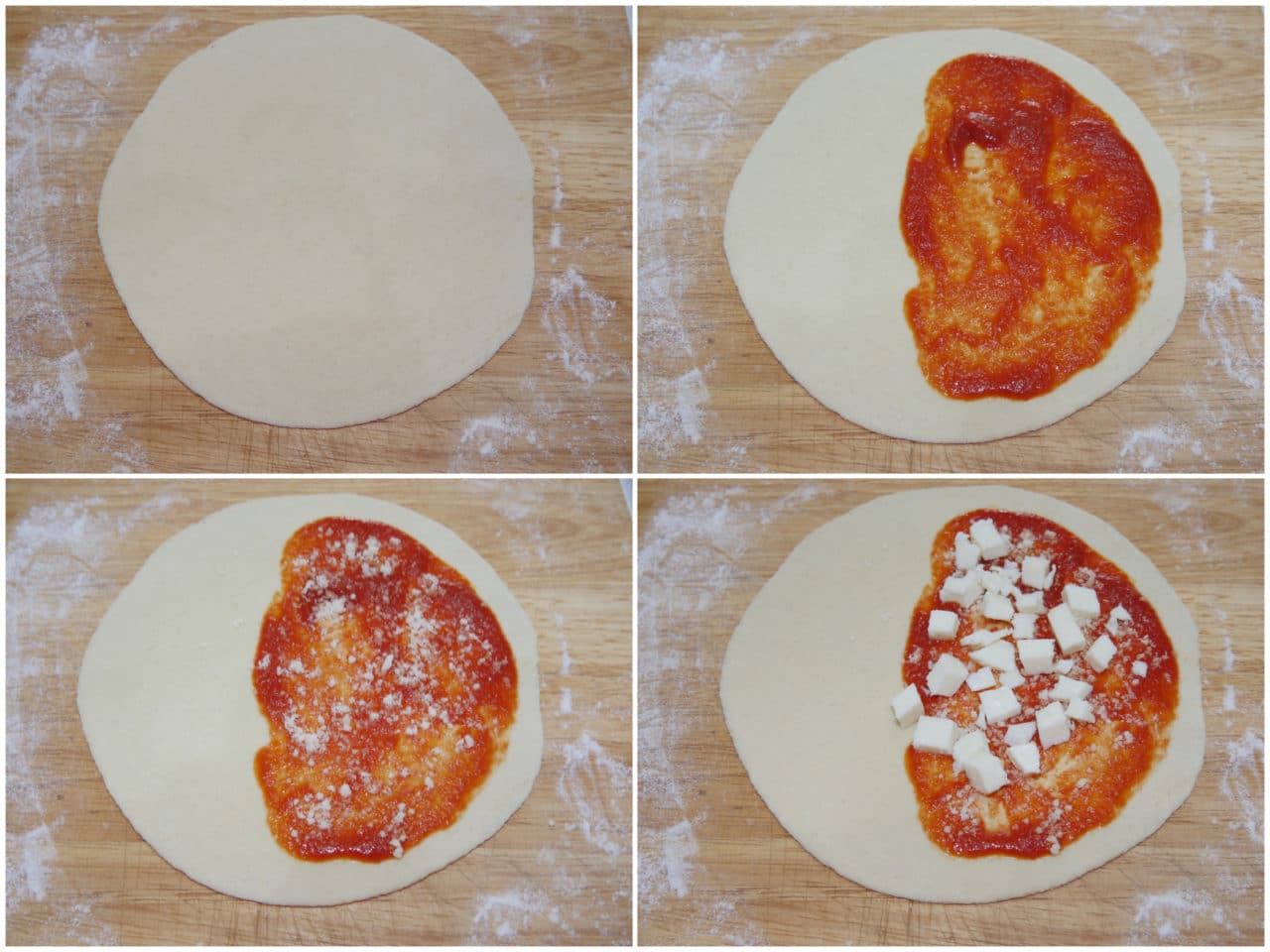 Quando l'impasto sarà pronto, prendete una pallina per volta e stendetela in una sfoglia circolare abbastanza sottile: condite metà del cerchio con passata, grana e fior di latte.