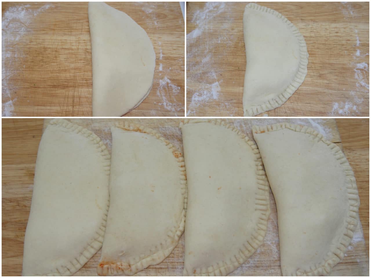 Richiudete la parte non condita sulla farcitura, creando una mezzaluna, e sigillate bene i bordi con i rebbi di una forchetta.