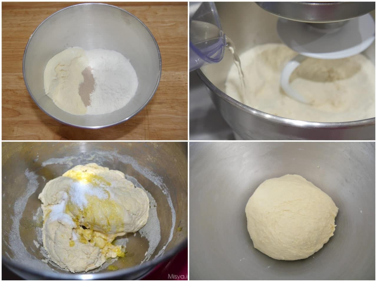 Innanzitutto mettete farine e lievito in una ciotola, versateci sopra l'acqua amalgamando, quindi incorporate anche sale e olio, continuando ad impastare fino a far incordare per bene l'impasto (ovvero: l'impasto deve staccarsi completamente dalle pareti e iniziare ad arrampicarsi lungo il gancio della planetaria).