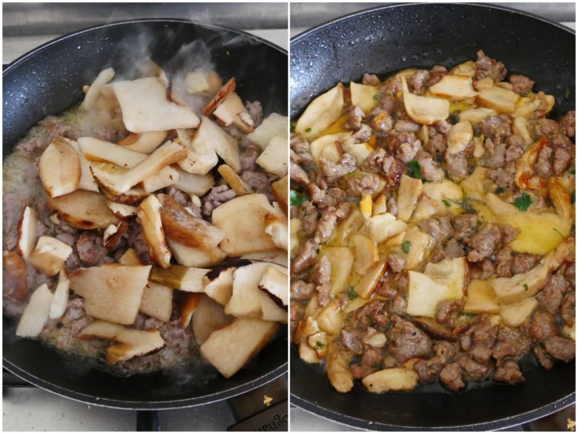 Aggiungete ora i funghi e fate cuocere ancora 10 minuti. Quindi salate, pepate e aggiungete il prezzemolo tritato.