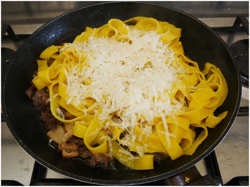 Scolate, mettete le tagliatele nella padella e mantecate insieme al parmigiano grattugiato.