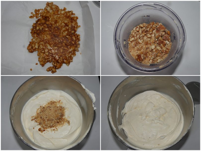 Infine, frullate grossolanamente il croccante alle mandorle ormai freddo e aggiungetene 2/3 al parfait (il resto lo userete per la decorazione), sempre mescolando con movimenti dal basso verso l'alto, in modo da non farlo smontare.