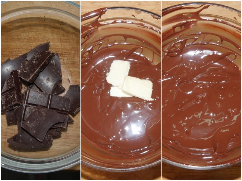 Prima di servire, preparate la salsa al cioccolato: fate sciogliere il cioccolato a pezzetti in microonde o a bagnomaria, quindi unite il burro e fatelo sciogliere stesso col calore del cioccolato, mescolando: in questo modo la vostra salsa risulterà bella lucida.