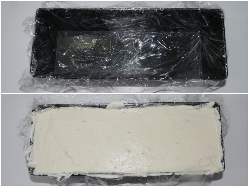 Foderate lo stampo con pellicola per alimenti, versateci dentro il composto, livellate bene la superficie e fate solidificare in freezer per almeno 6 ore o meglio ancora tutta la notte.