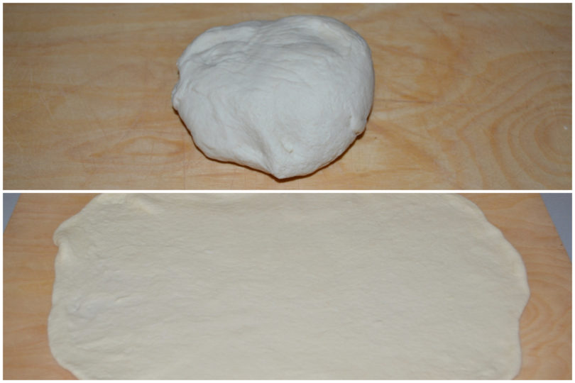 Preparate l'impasto per la pizza o acquistate una base pronta rettangolare. Stendete l’impasto della pizza fino ad ottenere una base rettangolare della stessa dimensione della teglia con uno spessore di 4 mm circa.