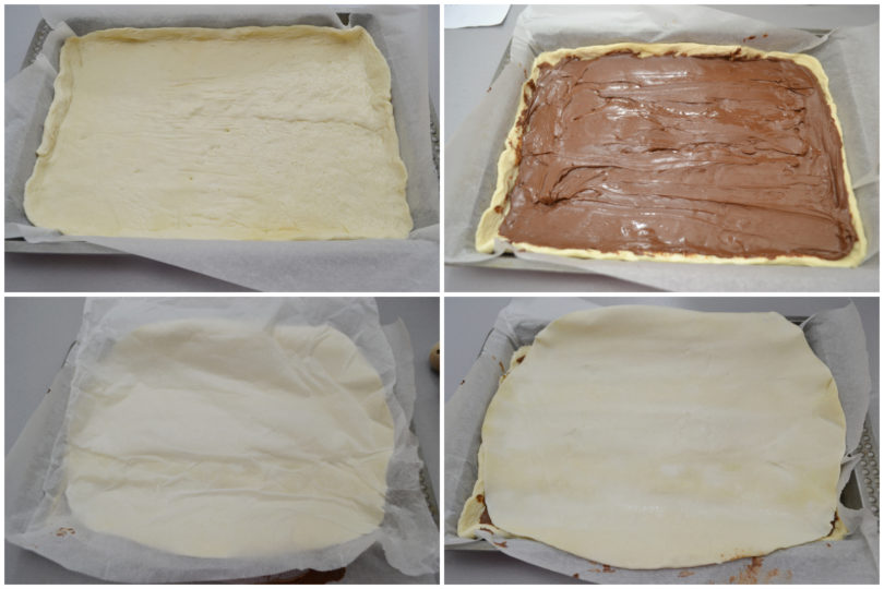 Rivestite di carta forno la teglia, quindi ricopritela con la pasta per pizze.Ricoprite con un generoso strato di nutella, quindi coprite con lo strato di pasta sfoglia.