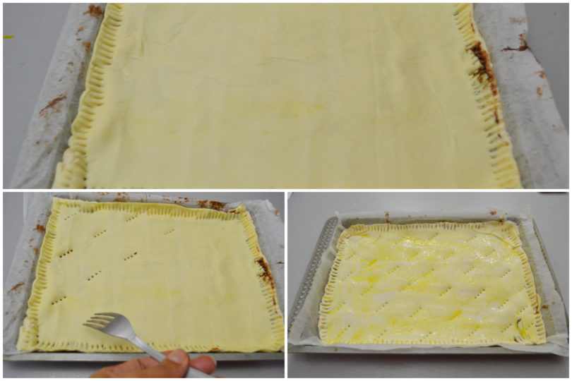 Sigillate bene i bordi della parigina alla nutella, spennellate con un uovo e cospargete la superficie con lo zucchero semolato, quindi bucherellate la sfoglia con i rebbi di una forchetta.