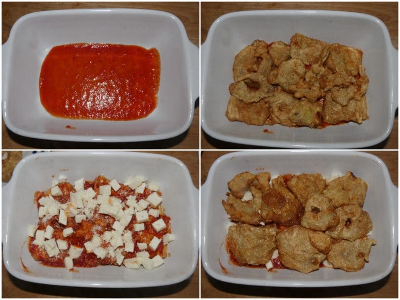Mettete sul fondo di una pirofila da forno uno stato di salsa quindi disponete un primo strato di carciofi fritti.Disporre sui carciofi la mozzarella tagliata a dadini, poi un po' di salsa e terminate spolverizzando con un po' di parmigiano grattugiato.