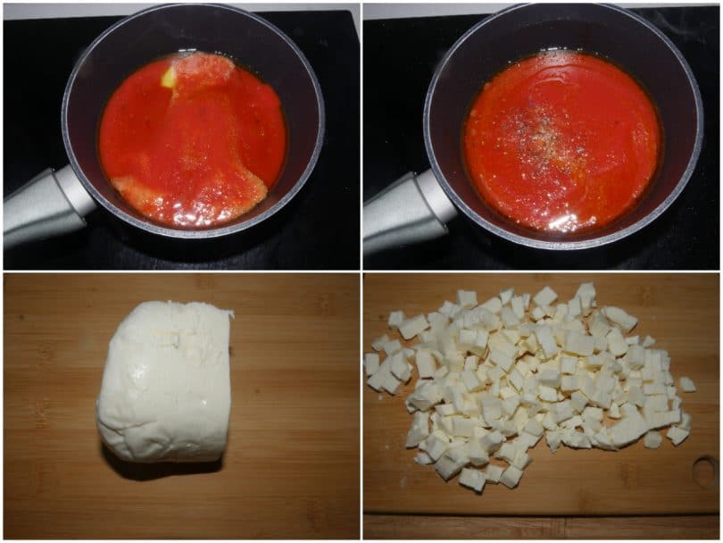 Preparate un sughetto facendo cuocere la passata di pomodoro in padella con un filo d'olio e un pizzico di sale. Tagliare a cubetti la mozzarella.