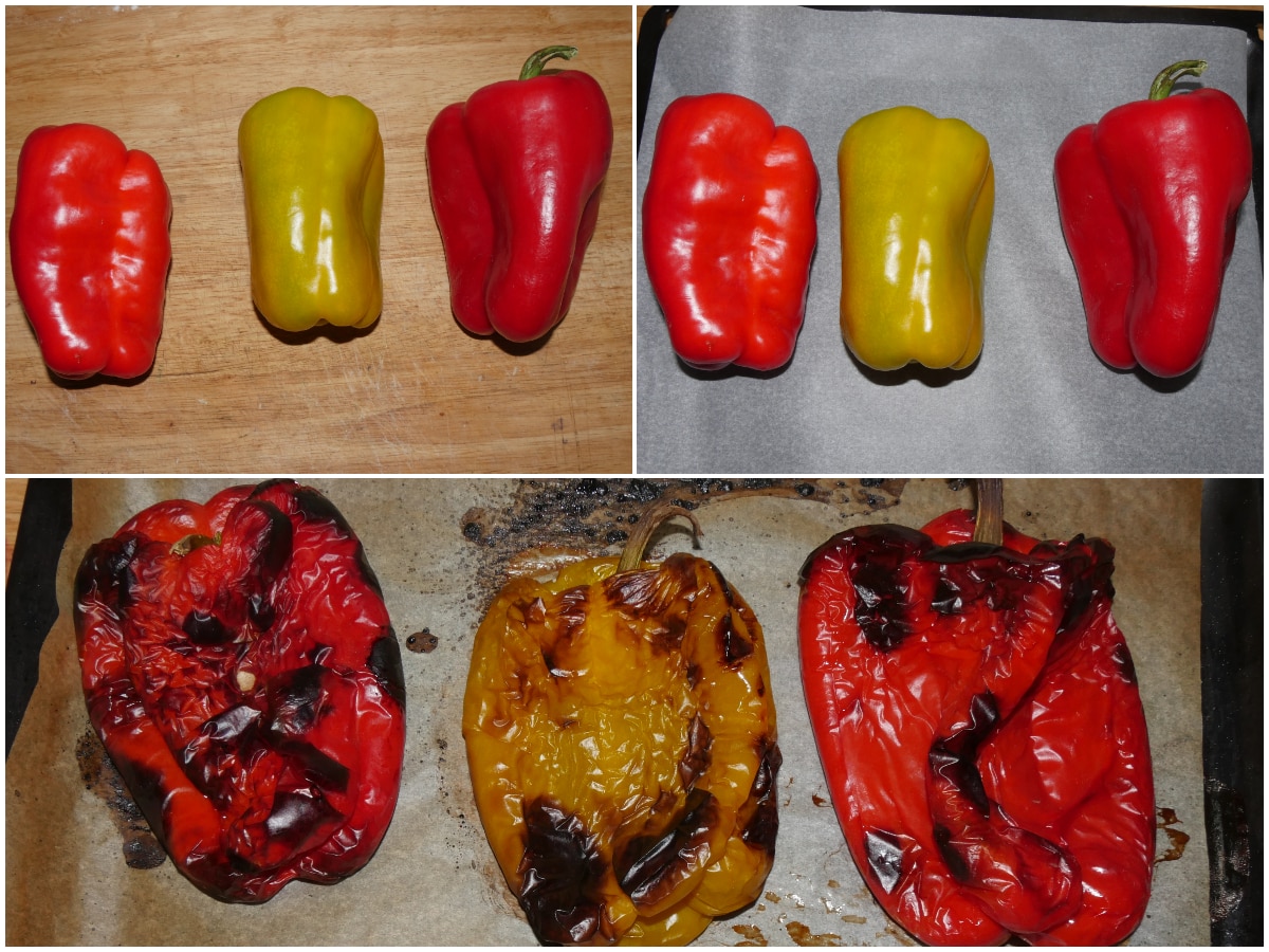 Lavate i peperoni, asciugateli e arrostiteli su una piastra oppure in forno per 30 minuti a 220°. In entrambe i casi...ricordatevi di girarli di tanto in tanto in modo che si abbrustoliscano uniformemente.Una volta arrostiti, copriteli con un coperchio per 15 minuti circa in modo che con l'umidità creata vi sarà più facile spellare i peperoni.