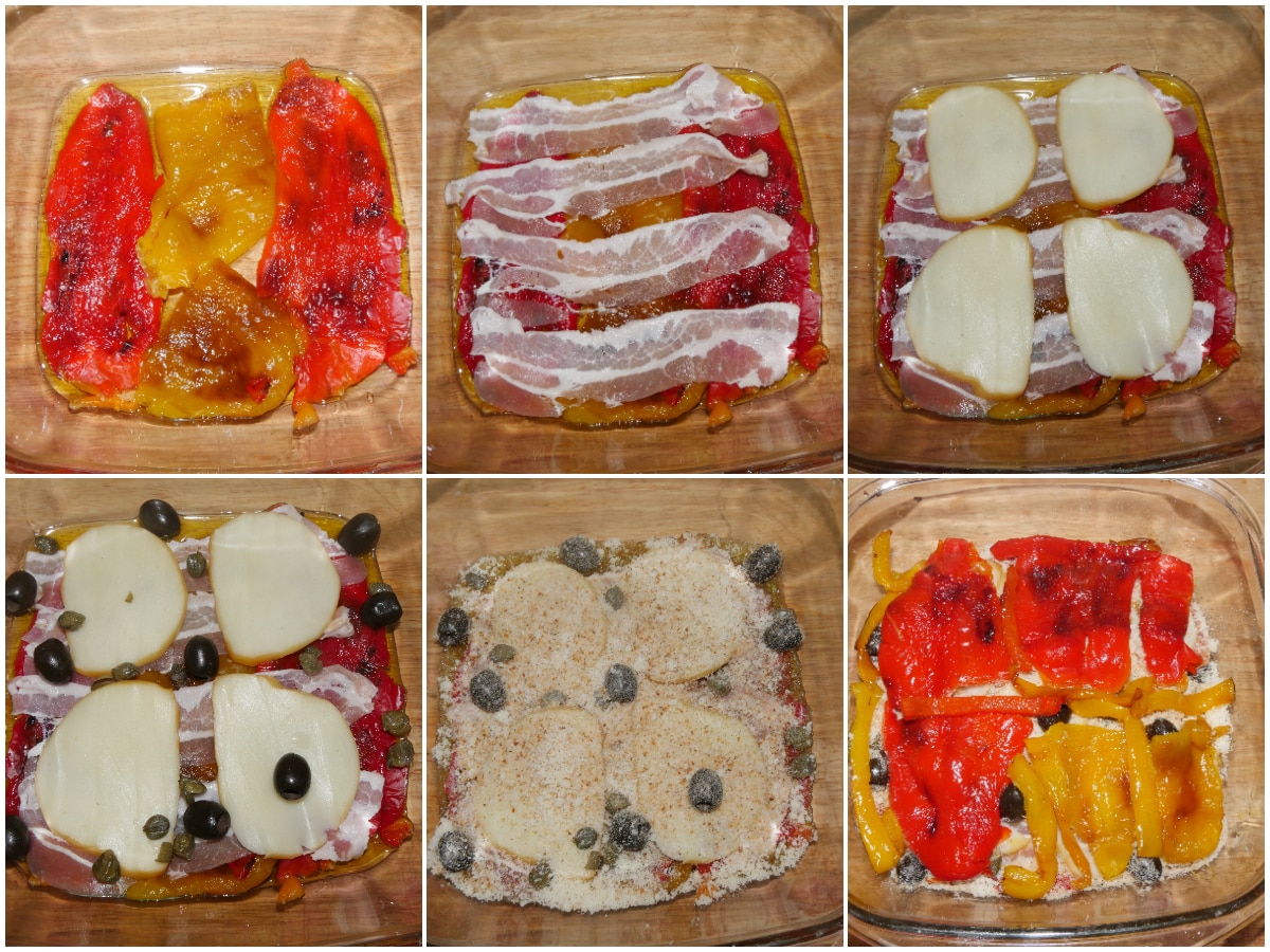 Adagiate sui peperoni la pancetta e la scamorza tagliata a fette molto sottili, aggiungete i capperi , le olive nere denocciolate (mi mancavano in casa) e spolverizzate il tutto con pangrattato e parmigiano.Ricoprire con uno stato di peperoni. Aggiungere ancora uno strato di ripieno, poi peperoni e finire con pancetta e scamorza Spolverizzare la parmigiana di peperoni con pangrattato e parmigiano grattugiato, versare un filo d'olio sulla superficie e infornare a 200°.Cuocere la parmigiana di peperoni per 20 minuti circa azionando il grill per gli ultimi minuti di cottura.