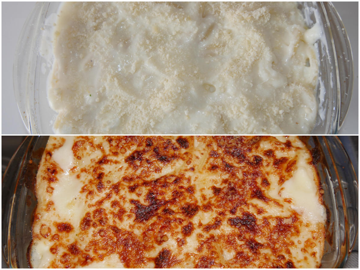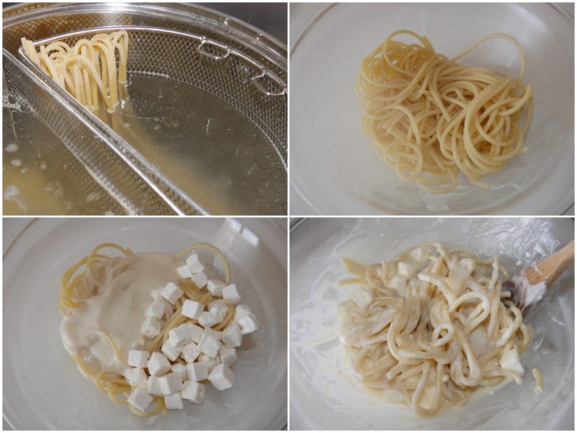 Nel frattempo, cuocete la pasta e scolatela ben al dente, quindi unitela con 3/4 della besciamella e tutta la feta tagliata a cubetti e mescolate.