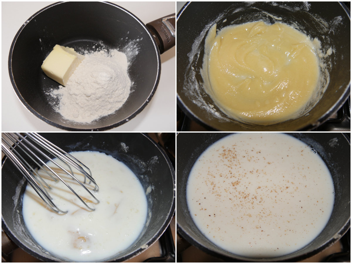 Innanzitutto preparate la besciamella: fate sciogliere il burro con la farina in un pentolino, mescolando, quindi incorporate il latte caldo, aggiustate di sale, pepe e noce moscata e portate a cottura sempre mescolando, fino ad ottenere una salsa densa e liscia.