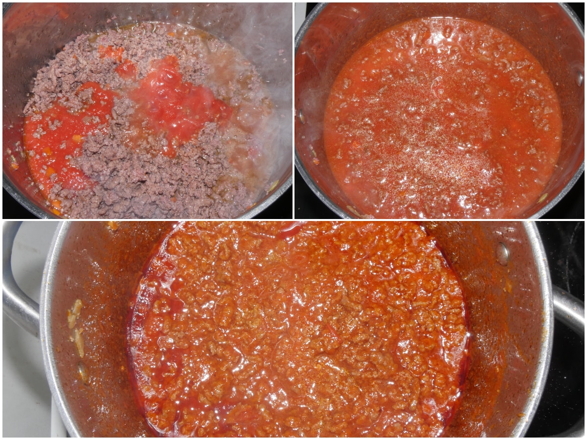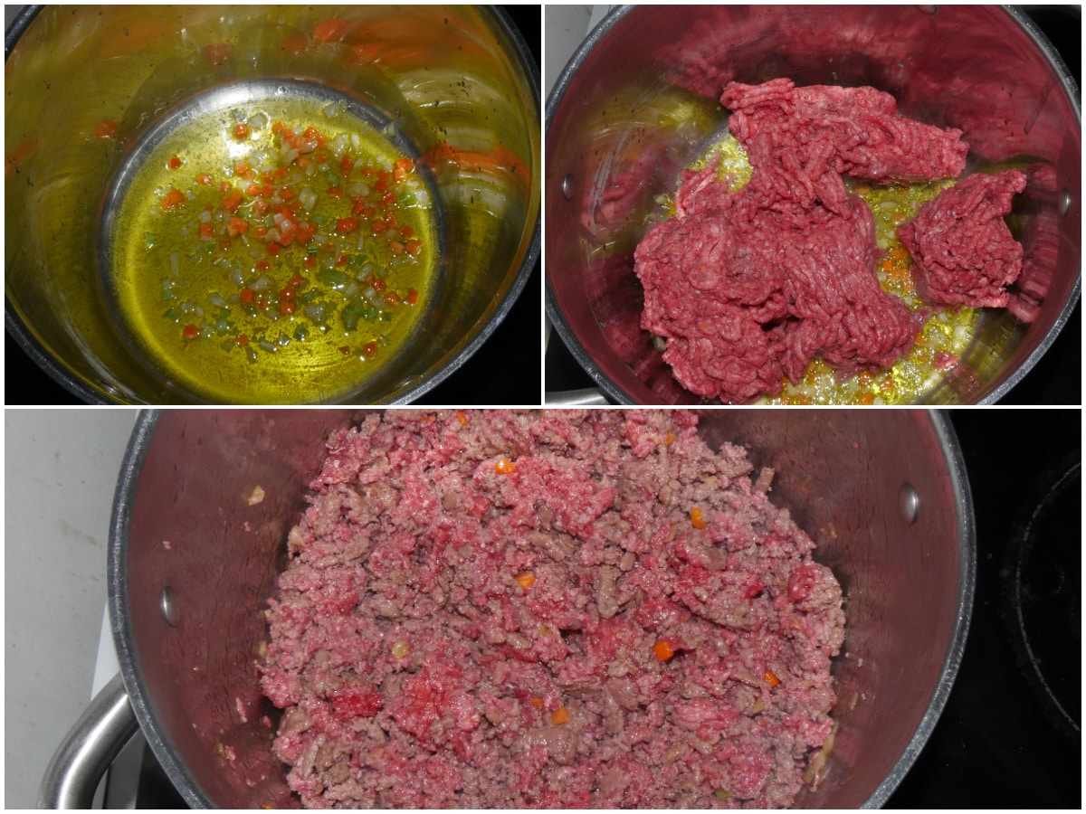 Preparate il ragù di carne mettendo il trito di carota sedano e cipolla in una casseruola con abbondante olio, poi unite 700 gr di carne macinata e fate rosolare il tutto. Poi sfumate con un pò di vino bianco.