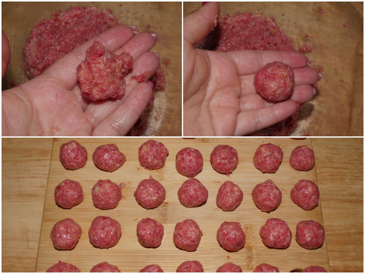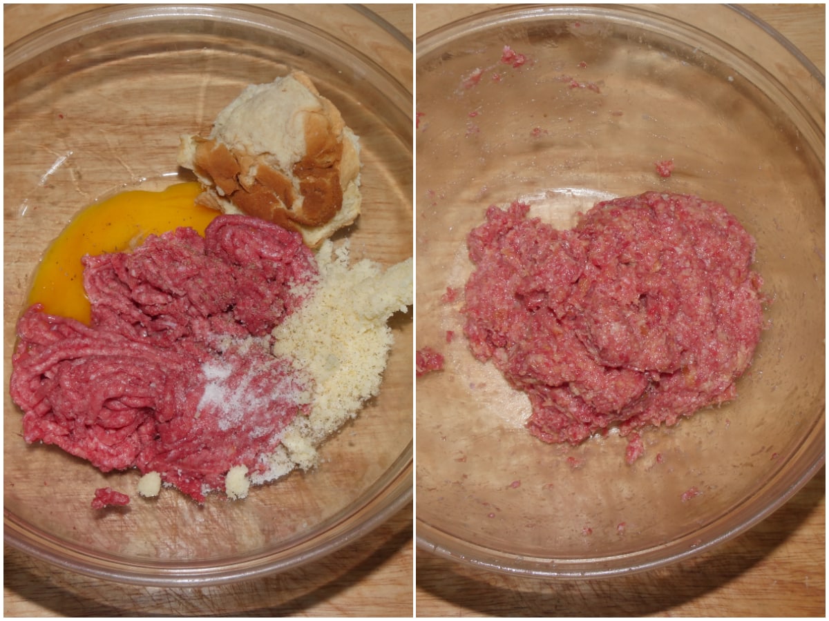 Fate ammorbidire la mollica di pane nell'acqua. In un piatto impastate la carne macinata con 1 uovo, 20 gr di parmigiano, la mollica di pane strizzata, il sale e il pepe.