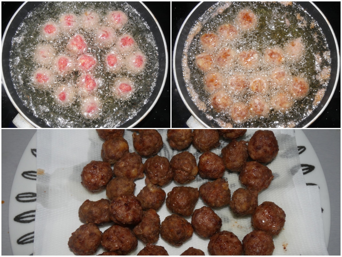 Friggetele nell'olio d'oliva. Disponete le polpettine di carne su della carta assorbente e tenetele da parte.