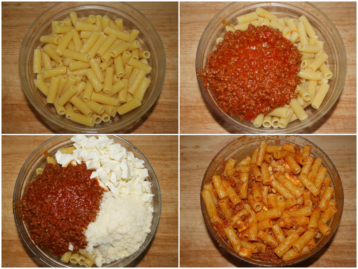In una ciotola abbastanza capiente condite la pasta con metà del sugo, 3/4 della mozzarella, 3/4 del parmigiano e mescolate.