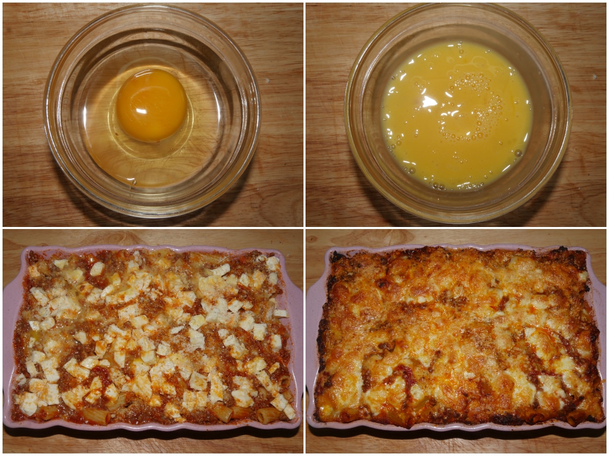 Versate un uovo battuto sulla teglia di pasta al forno e infornate a 180°C per 40 minuti circa.