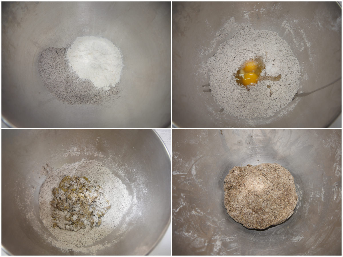 Unite le farina in una ciotola o su un piano di lavoro, mettete uova e sale al centro e iniziate ad impastare con una forchetta, quindi lavorate a mano (o con una planetaria) per almeno 15 minuti (aggiungendo poca acqua tiepida se necessario), fino ad ottenere un impasto sodo e omogeneo.