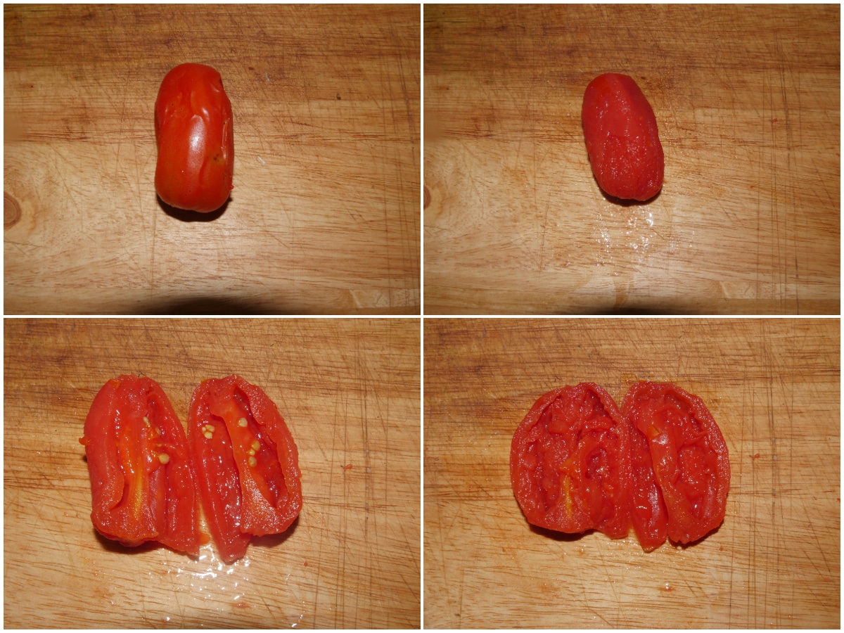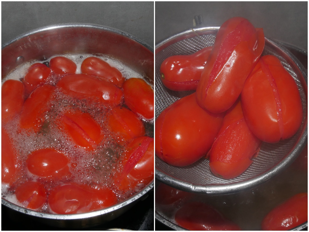 Innanzitutto lavate bene i pomodori, sbollentateli per circa 15 minuti (finché la pelle non inizierà a spaccarsi) e scolateli.