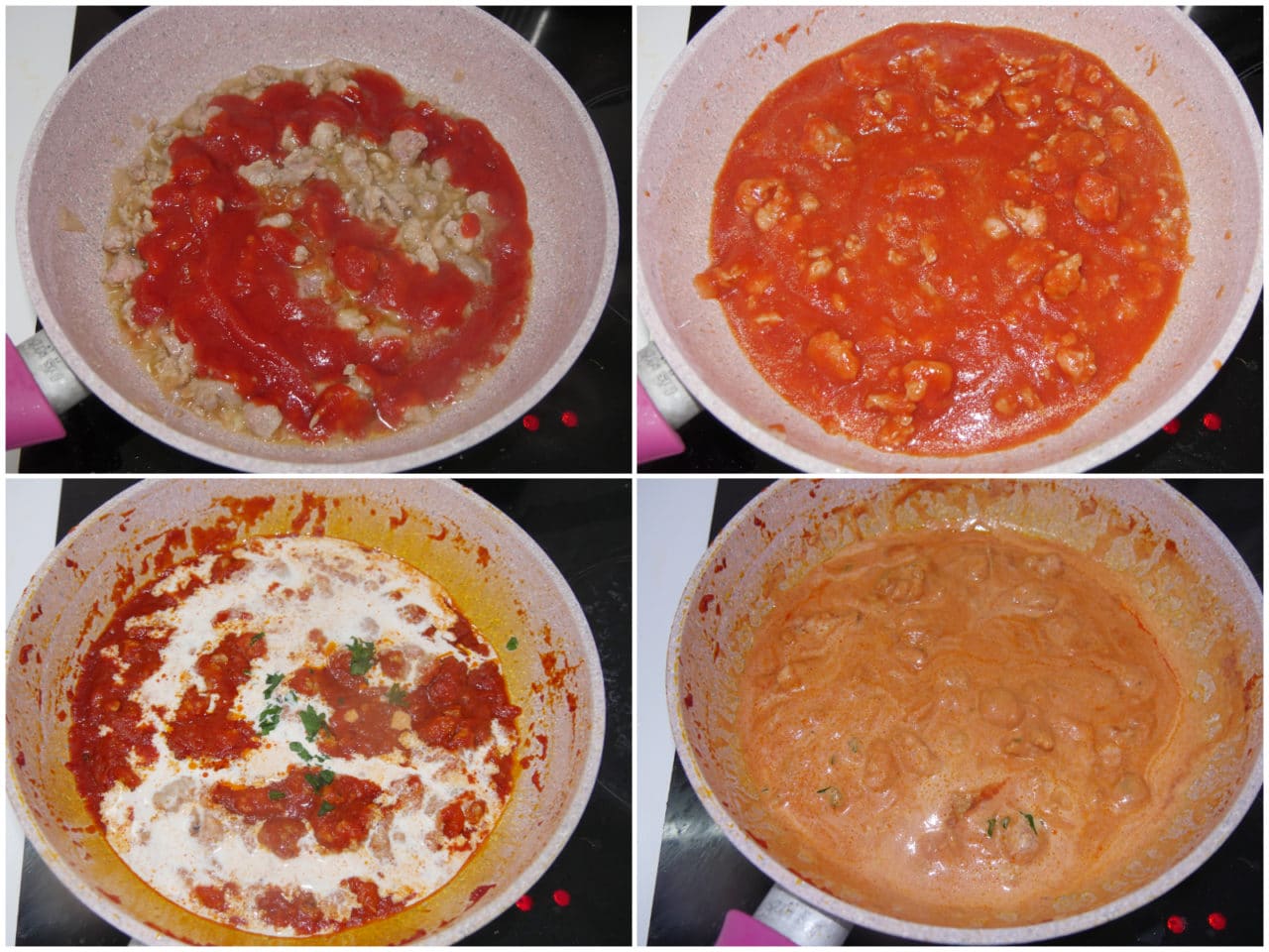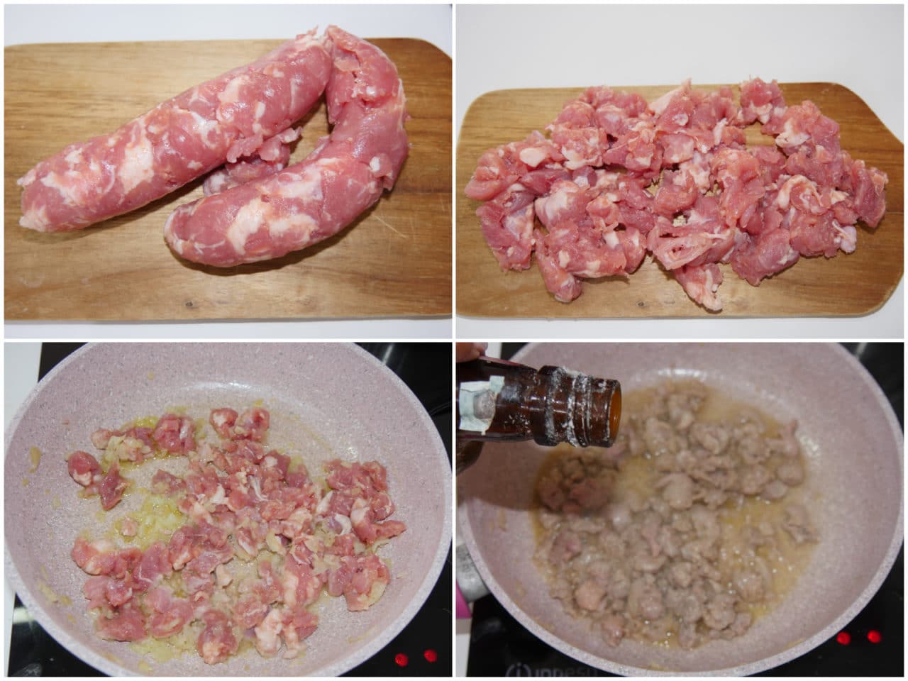 Innanzitutto eliminate il budello dalle salsicce e sbriciolatele, quindi fatele rosolare in una casseruola antiaderente con cipolla e olio, infine (quando la cipolla sarà ben appassita) sfumate col cognac.