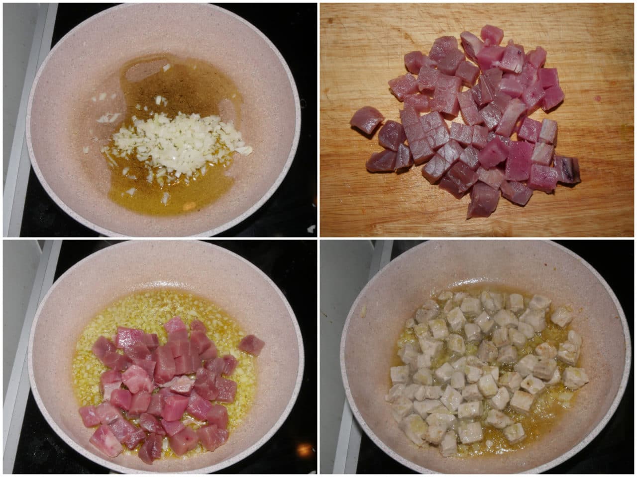 Tagliate il tonno a cubetti, aggiungetelo nella padella e lasciatelo rosolare.