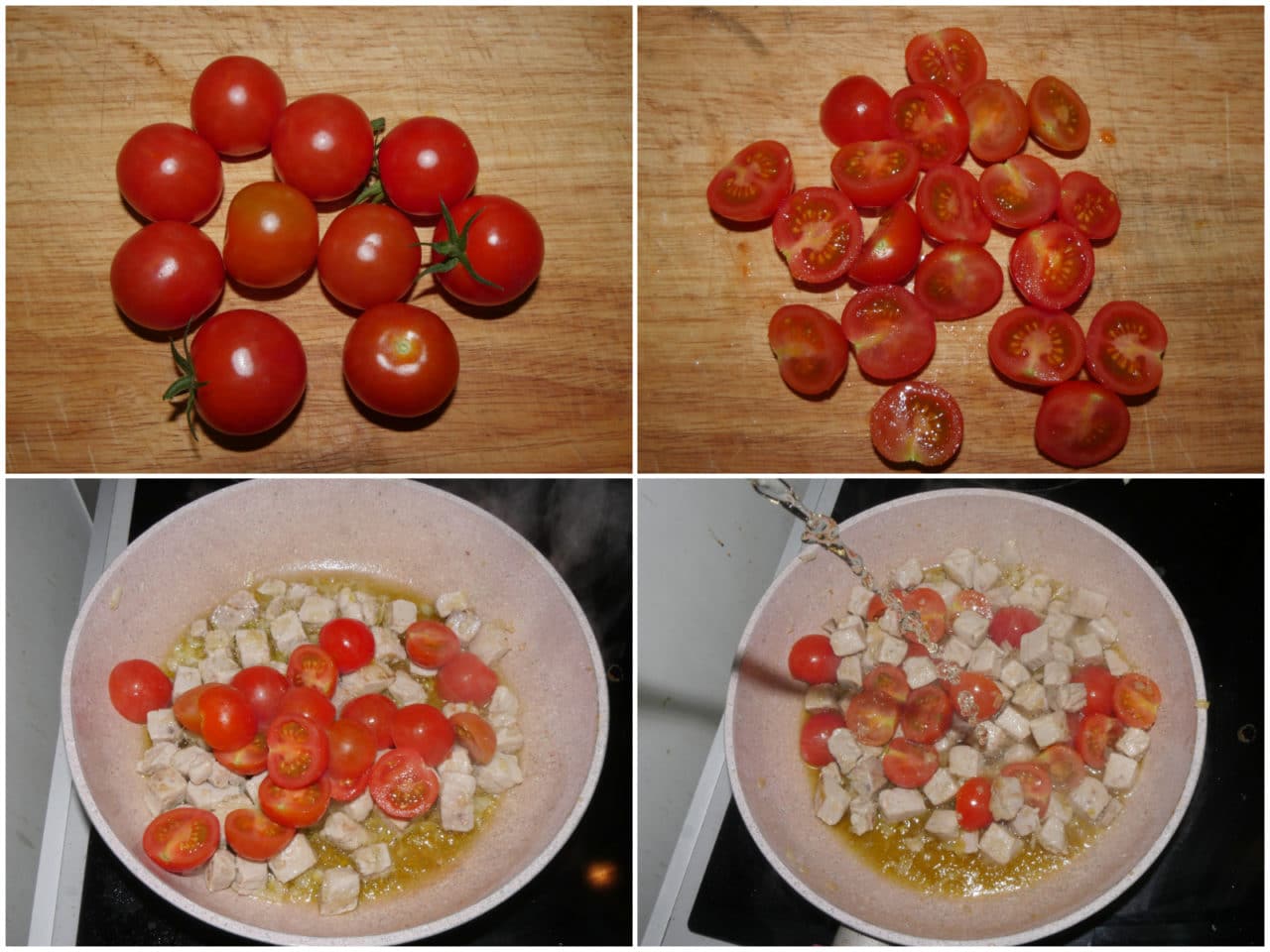 Mettete a bollire l'acqua per la pasta (leggermente salata), lavate i pomodorini e tagliateli a metà (o in più parti), aggiungeteli nella padella e sfumate con il vino.