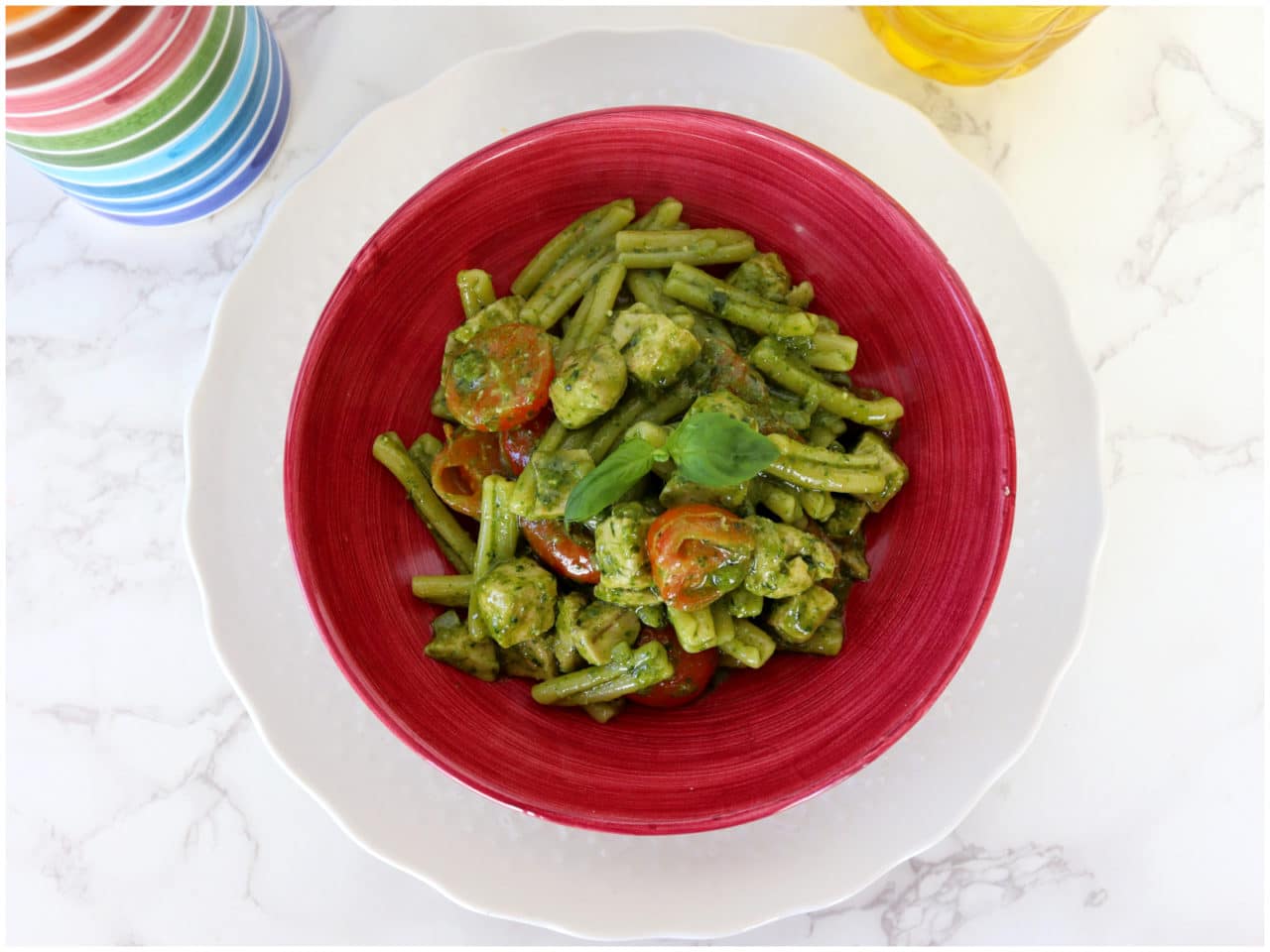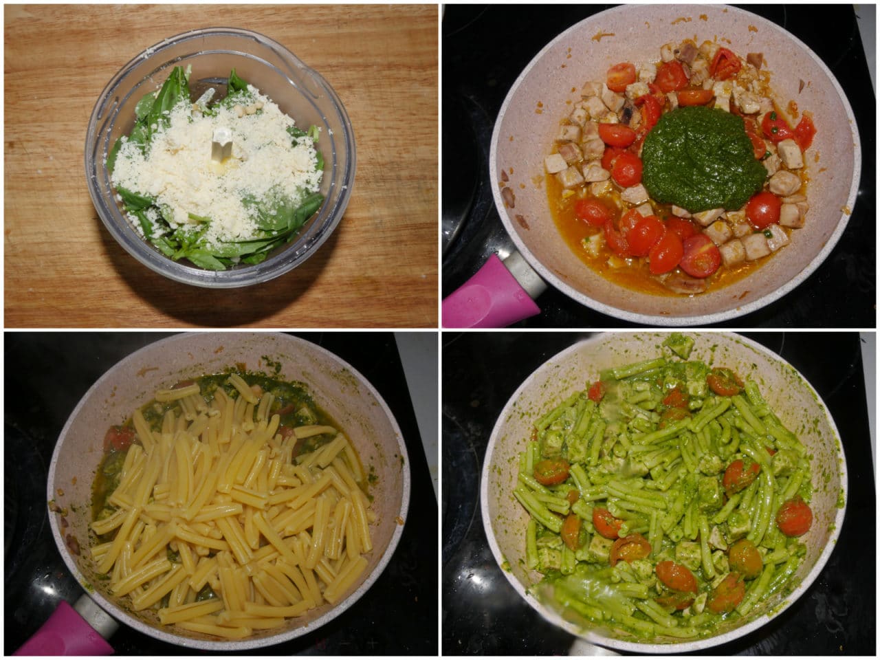 Preparate il pesto (se non ne avete di pronto) e aggiungetelo nella padella insieme con la pasta scolata al dente.