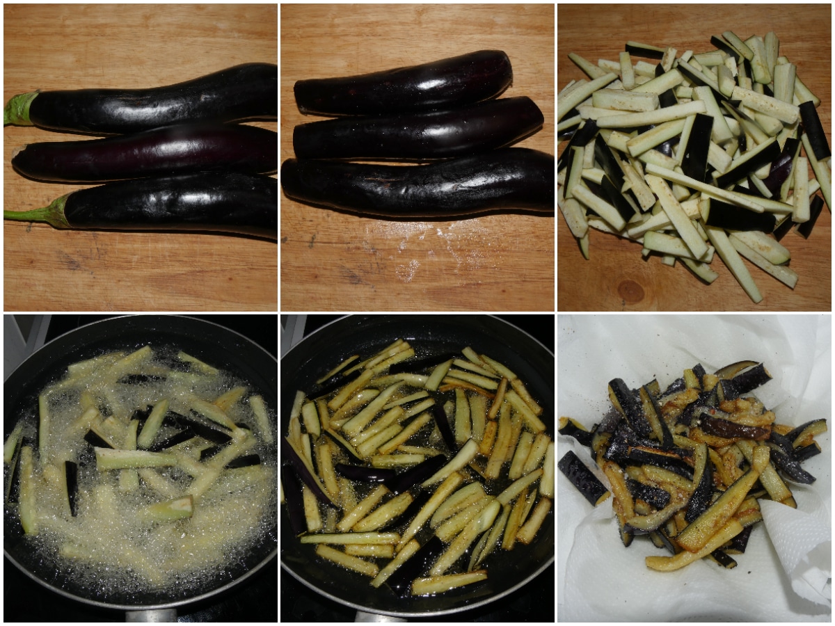 Lavate e spuntate le melanzane e tagliarle a bastoncini, friggerle in abbondante olio di semi di arachidi.