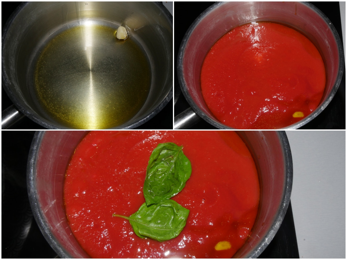 Preparare un sugo con la passata insaporita con olio extravergine d'oliva, basilico e sale e lasciarlo cuocere per una mezzoretta .