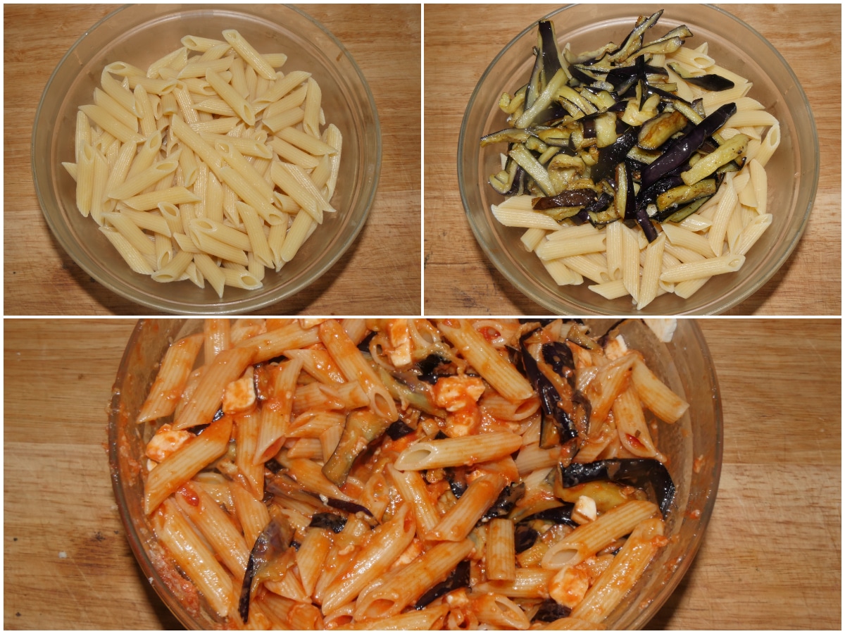 Mettete la pasta in una ciotola e condite con alcuni mestoli di sugo, la metà del parmigiano grattugiato,3/4 di fiordilatte tagliato a dadini, 3/4 delle melanzane il basilico e del pepe.
