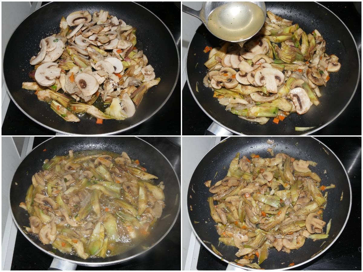 Fate appassire il misto per soffritto in un'ampia padella antiaderente con un po' di olio e lo spicchio d'aglio, quindi unite funghi e carciofi (dopo averli scolati), aggiungete 1 mestolo di brodo e cuocete con coperchio per 10-15 minuti.