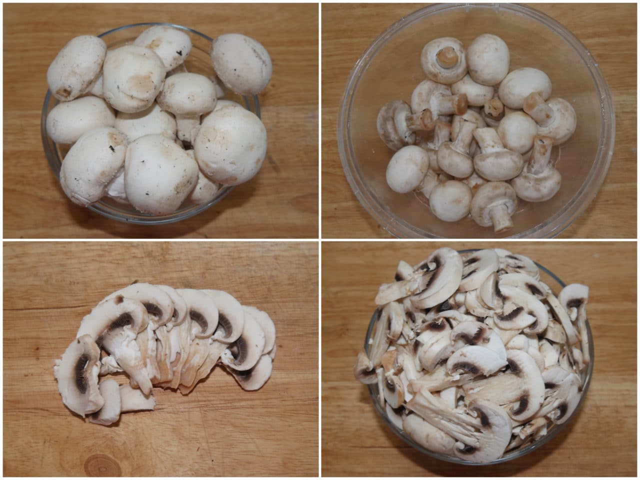 Pulite i funghi dalla terra con un pennellino e tagliate anche questi a fettine sottili.